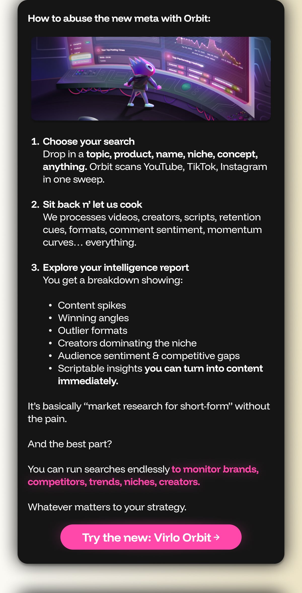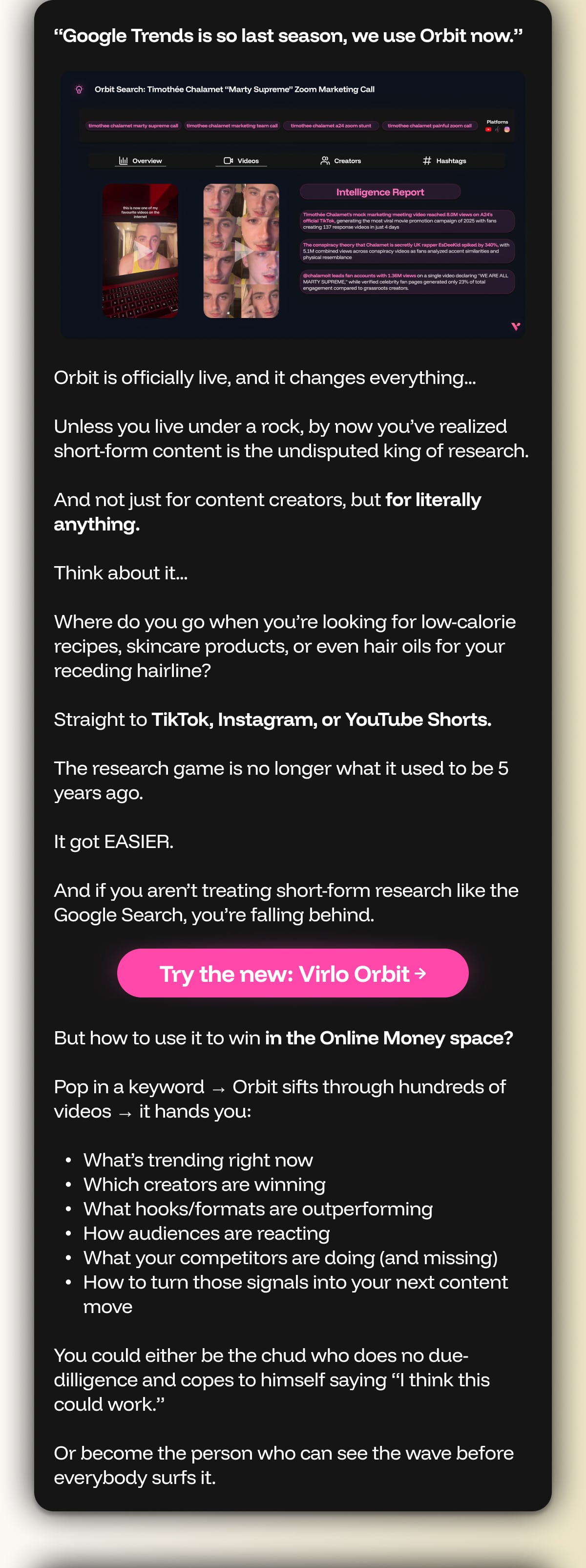 “Ahhhh. I just can’t keep it a secret anymore. They don’t want me to talk about it, but I do whatever I want here. When this new update comes out (very very soon), Orbit + the feature I can’t name are going to change the game FOREVER. It doesn’t matter what you want to create, we can do it, and do it well. I’m not gonna spoil the surprise tho dw. Just know, when this drops, you and your business might see an unexpected 3x in revenue after just a week.“ - Vee